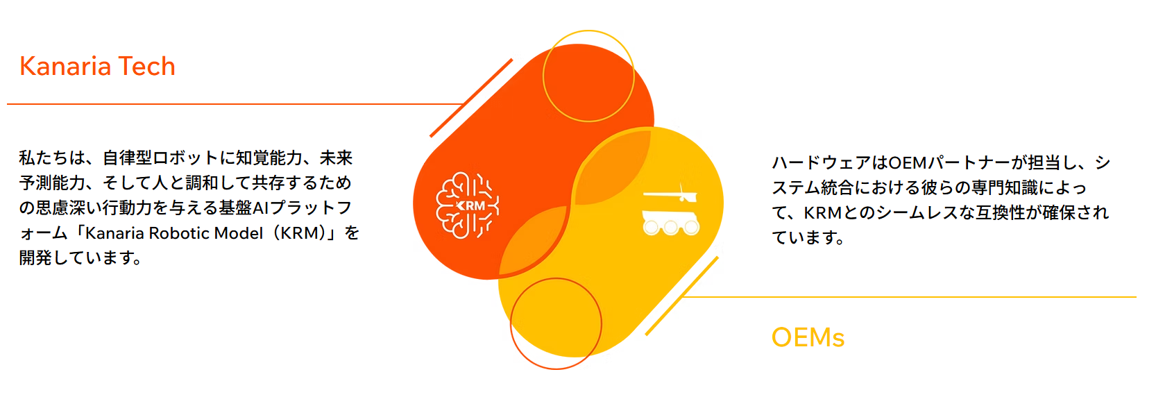 私たちの開発する『KRM』は、人の<目>の役割をするカメラと、その映像データによって学習する<脳>を持ち、人間のように周囲を理解しながら自然に動くロボットを実現するAIプラットフォームです。システムには高い汎用性があり、メーカーを問わず、さまざまなロボットに後付けすることができます。