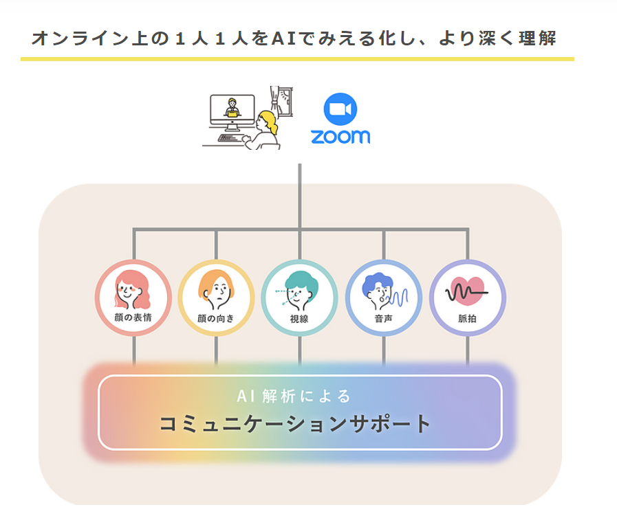 そこに目を付けて事業を始めたのが、2020年6月創業の株式会社I’mbesideyouだ。手掛けるのは、Zoomのようなオンラインコミュニケーションの動画解析。AIで表情や視線、音声など複数の情報を総合的に解析して、コミュニケーションの質を高めようとしている。