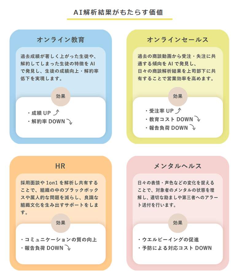 I’mbesideyouのサービスは、すでにさまざまなシーンで活用されている。たとえば、オンライン教育サービス。授業の動画を解析し、先生と生徒のコミュニケーションを見える化することで、適切な指導ができているかをチェックする。解析内容に基づいて改善していけば、生徒の成績アップなどにも繋がる。他には、オンラインセールスでの活用。過去の商談動画から受注・失注に共通する傾向をAIで発見し、より良い関係性構築のためのコミュニケーションを考えることができる。さらに、“コロナ鬱”が増える昨今、「職員のメンタル状態をいち早く感知したい」という目的で、オンライン会議の動画解析ニーズも増えているという。精神科医の診断と動画解析AIの診断で95%のアキュラシーが出ているなど、かなり正確性は高い。